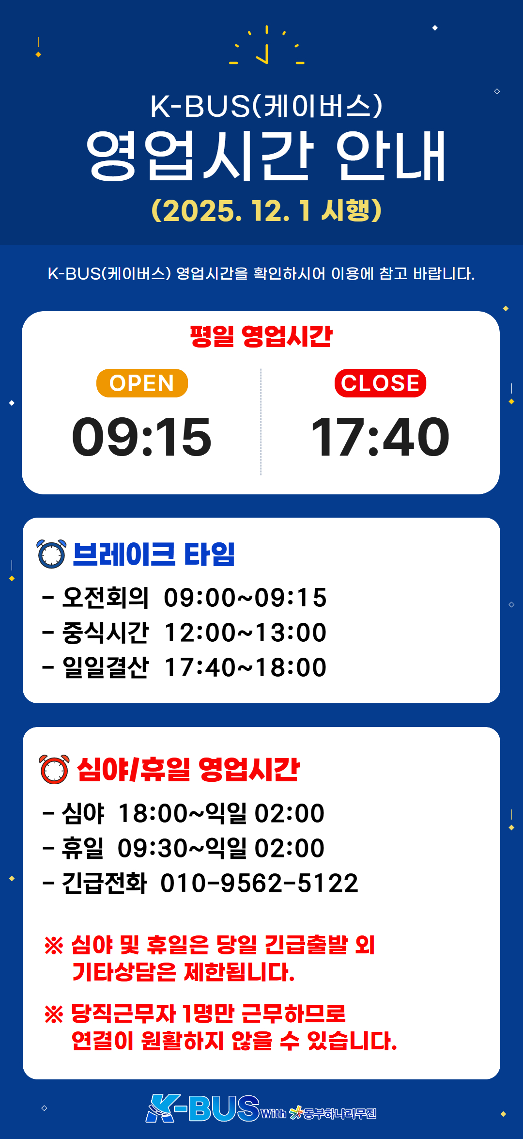 기분 좋은 여행의 시작~ K-BUS(케이버스)에서 영업시간을 안내해 드리오니 이용에 참고 바랍니다. ■ 평일 영업시간 ■ 09:15~17:40 ■ 브레이크타임 ■ 오전회의 09:00~09:15 중식시간 12:00~13:00 일일결산 17:40~18:00 ■ 심야/휴일 영업시간 ■ 심야 18:00~익일 02:00 휴일 09:30~익일 02:00 긴급전화 010-9562-5122 ※ 심야 및 휴일은 당일 긴급 출발 외 기타상담은 제한됩니다. ※ 당직근무자 1명만 근무하므로 연결이 원활하지 않을 수 있습니다. (시행일 2025. 12. 1)